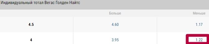 Допустим, мы выбрали «Индивидуальный тотал «Вегаса» меньше 4» с коэффициентом 1.22.