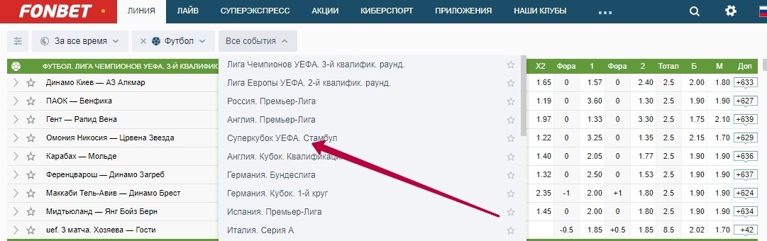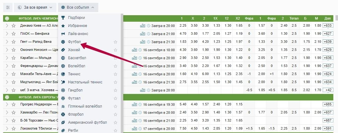 2. Вновь кликаем раздел «Все события», который теперь откроется справа от выбранного вида спорта.