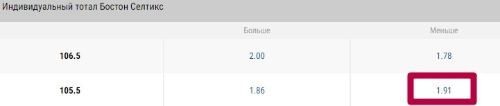 Пример. Матч Национальной баскетбольной ассоциации между «Бостон Селтикс» и «Майами Хит». Допустим, мы решили поставить на «Тотал очков «Бостона» меньше 105.5» с коэффициентом 1.91.