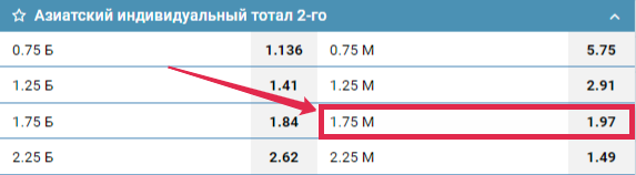 Обозначение азиатского тотала заканчивается либо на .25, либо на .75. Такое пари автоматически разделяет сумму и ставку на две равные части. Сначала вычтите от показателя тотала 0.25 — это будет первая часть, а потом прибавьте к стартовому показателю 0.25 — это будет вторая часть. Например, азиатский ИТМ2 1.75 состоит из ИТМ 1.5 и ИТМ2 2.0.