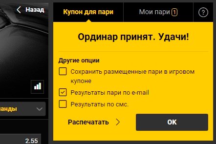 После нажатия кнопки «Заключить пари» система букмекерской конторы сообщит об удачном размещении пари и пожелает удачи. Здесь же игрок может выбрать, чтобы результат его пари был прислан на электронный адрес или даже в смс-сообщении. Количество бесплатных смс-сообщений ограничено тремя.