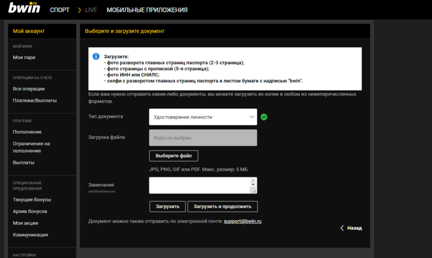 Сразу после завершения процедуры регистрации на сайте bwin.ru необходимо подтвердить личность. Для этого загрузите на сайт букмекера фотографии документов: