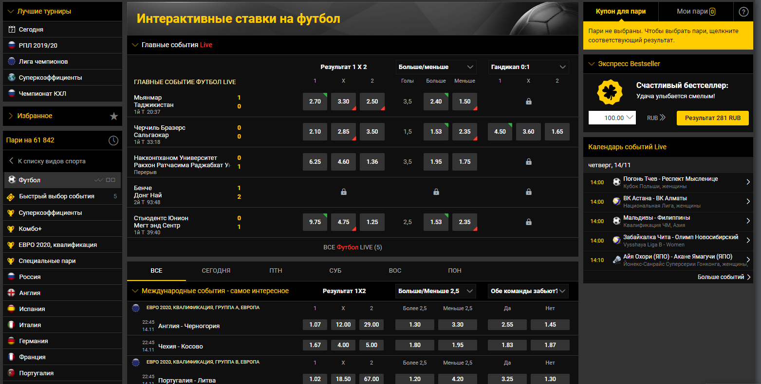 Чтобы выбрать и зарегистрировать ставку, достаточно кликнуть по интересующему его коэффициенту, и выбранный вариант немедленно отобразится в купоне в правом углу экрана. Внутри купона выберите сумму для ставки, а также предпочитаемый вариант ставки: ординар, система, экспресс. Для совершения экспресс-ставок и систем очень удобно, что купон сохраняет выбранные ставки до тех пор, пока игрок их не удалит сам.
