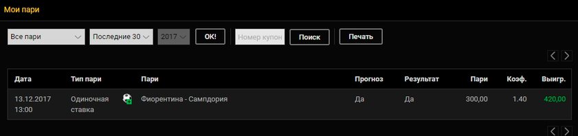 История сделанных ставок хранится в меню «Мои пари» и доступна за выбранный период.