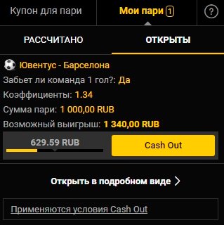 Отметим, что букмекерская контора bwin предоставляет услугу «cash out», позволяющую вывести часть денежных средств до того, как результат ставки станет известен. Система букмекера автоматически считает, сколько клиент может вывести в конкретный момент. Функция доступна в меню «Мои пари», которое находится рядом с «Купоном для пари» в правой части экрана.