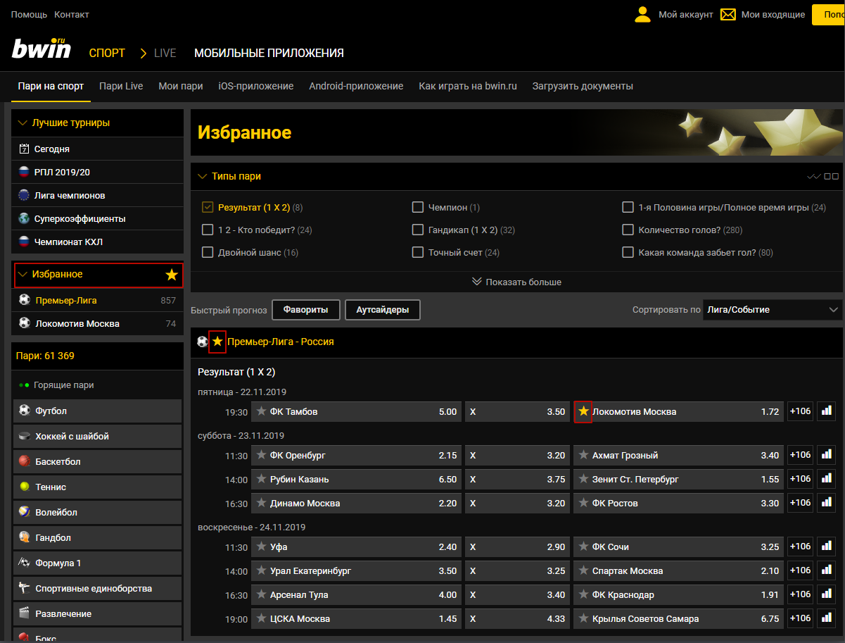 Все виды спорта, доступные для ставок в букмекерской конторе «Бвин», приведены на главной странице сайта, в вертикальном меню слева. Любой турнир или конкретный матч можно занести в меню «Избранное», нажав на иконку звезды рядом с названием турнира или матча.