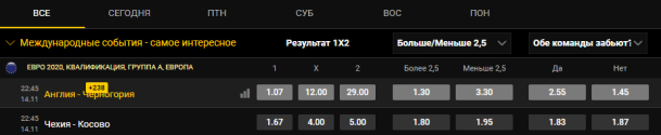 После перехода по линии букмекера на определенный вид спорта откроются все соревнования в левом меню, а также наиболее интересные соревнования за ближайшее время в самом центре экрана.