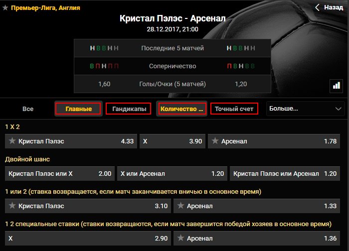 Для удобства поиска роспись разбита на рынки, которые указаны сразу под статистикой выбранного спортивного события.