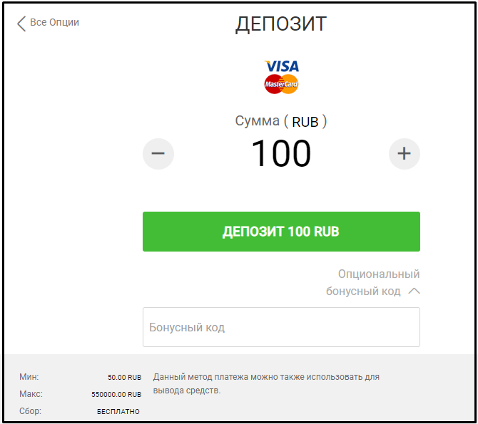После выбора платежной системы введите желаемую сумму для депозита, а также бонусный код при его наличии.