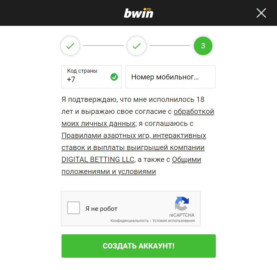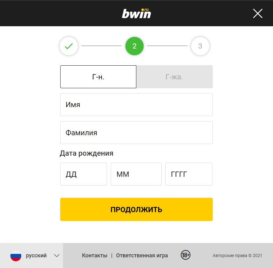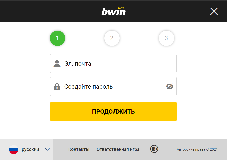 Сразу при входе на официальный сайт российского онлайн-букмекера www.bwin.ru в правом верхнему углу нажмите на кнопку «Регистрация». Сам процесс проходит в три шага: