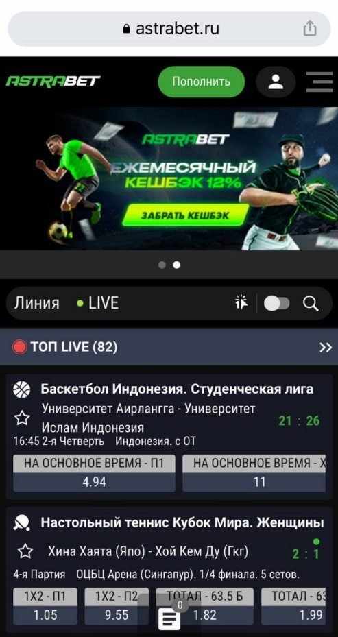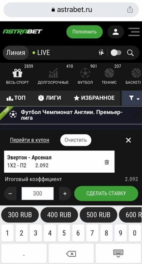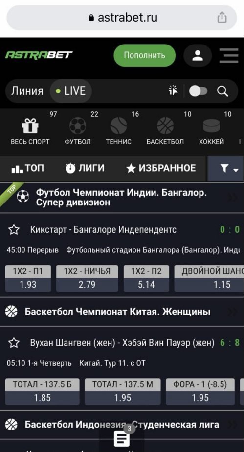Ставки в БК «Астрабет» разделены на две привычные категории — Live и «Линия».