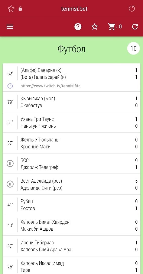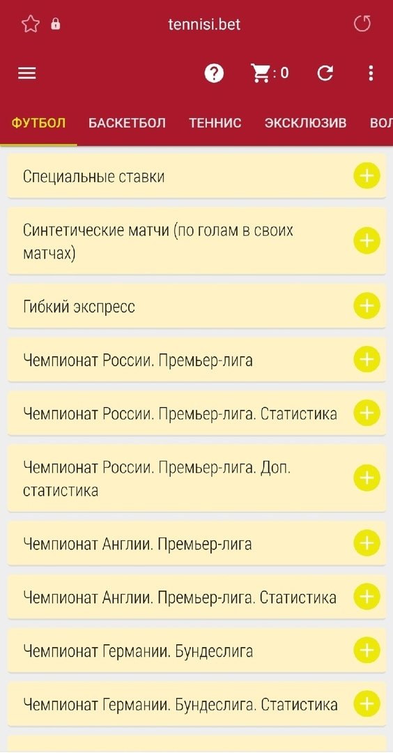 Виды спорта, доступные для ставок в букмекерской конторе «Тенниси», приведены в вертикальном меню с левой стороны страницы. Линия по видам спорта небольшая, но зато есть уникальные предложения в разделе «Эксклюзив» (чтобы просмотреть ставки, нужно кликнуть по названию в левом меню).