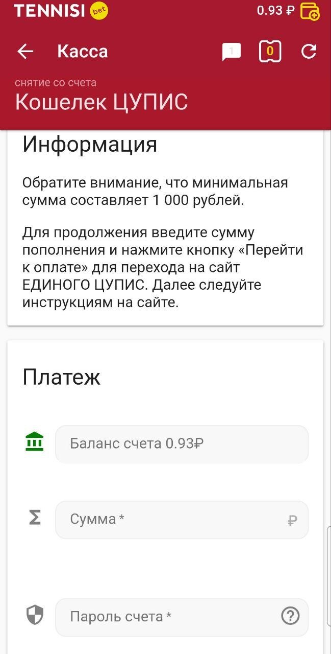 Для начала игры в букмекерской компании Tennisi необходимо пополнить свой игровой счёт. Сделать это можно в верхнем меню, в разделе «Ваш счёт» и подразделе «Пополнение счёта». Также процедуру пополнения счёта можно осуществить через личный кабинет Единого ЦУПИС. Все последующие пополнения делаются аналогично.