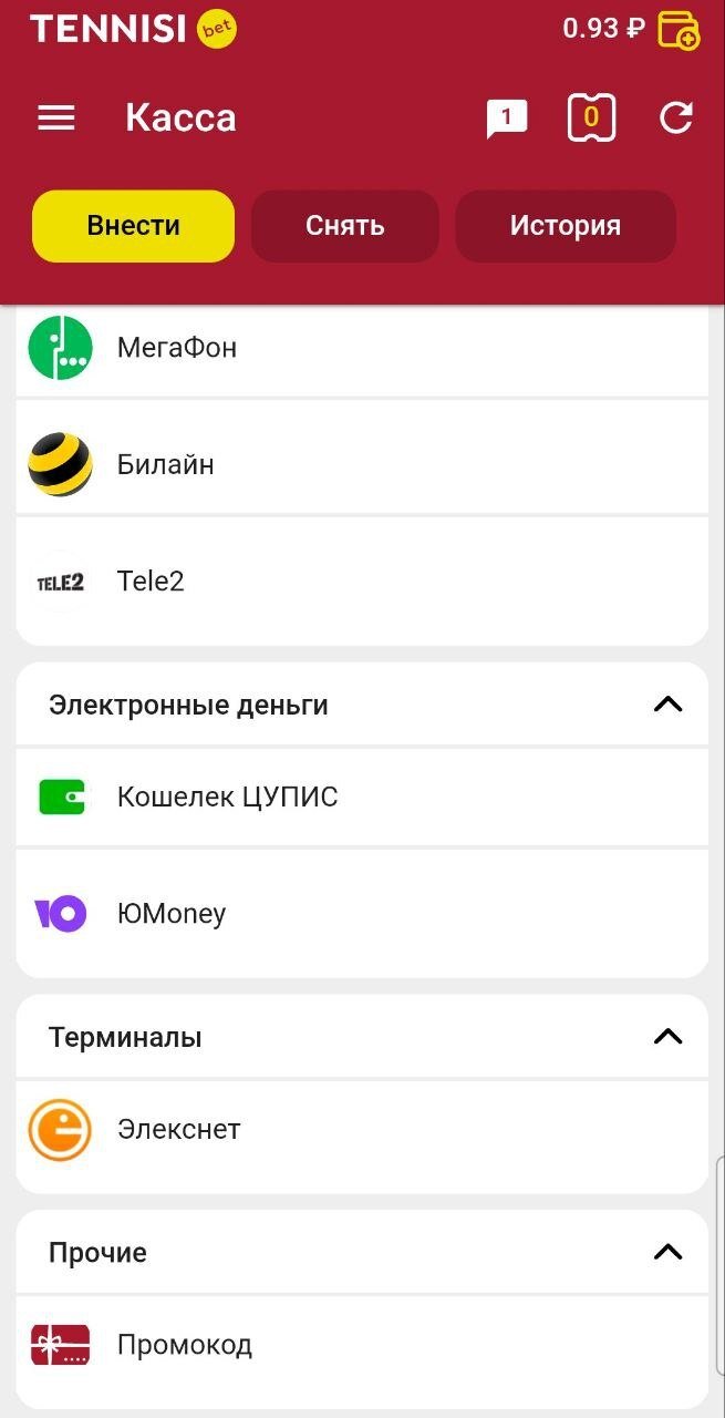 Вывести деньги из букмекерской конторы «Тенниси» можно следующими способами: