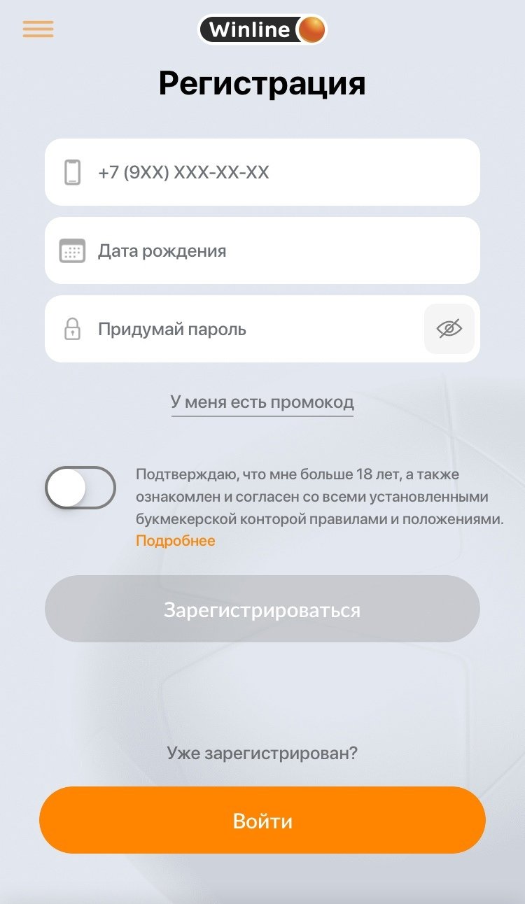 Форма регистрации появится сразу после запуска мобильного приложения У Winline в России нет полноценной мобильной версии сайта. . Открыть её вновь можно, выбрав пункт «Регистрация» вверху главного экрана.