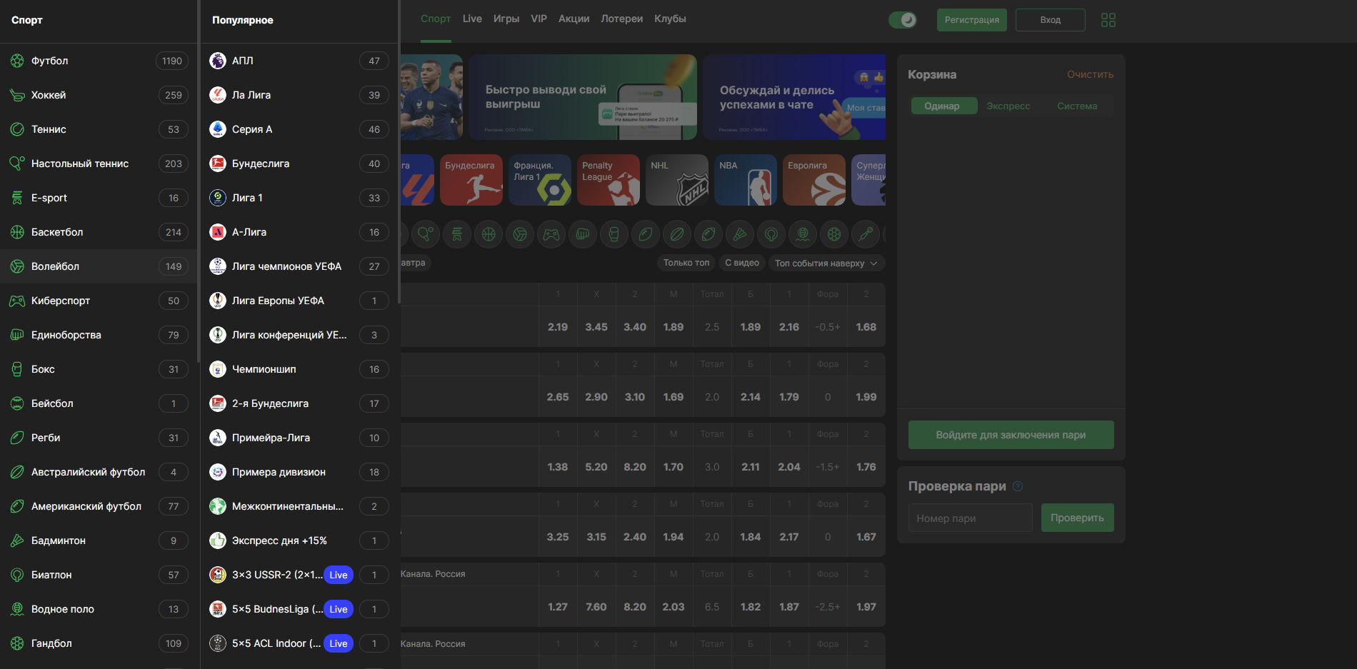 Выбираете вид спорта, матч и исход.