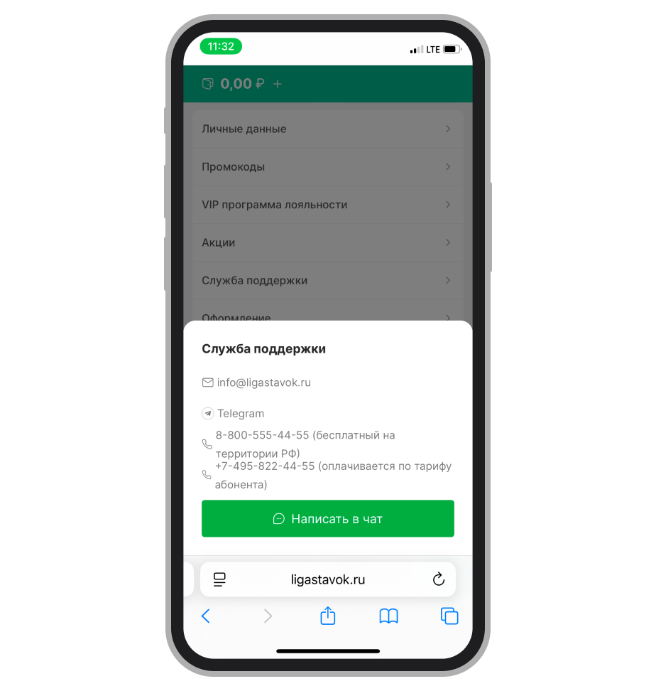 На сайте «Лиги Ставок» есть онлайн-чат, сотрудники службы поддержки отвечают быстро и готовы решить большинство проблем игрока. Помимо этого, работает бесплатный телефон горячей линии +7 (800) 555-44-55. Электронная почта info@ligastavok.ru. А также телеграм-бот @ligastavok_official_bot.