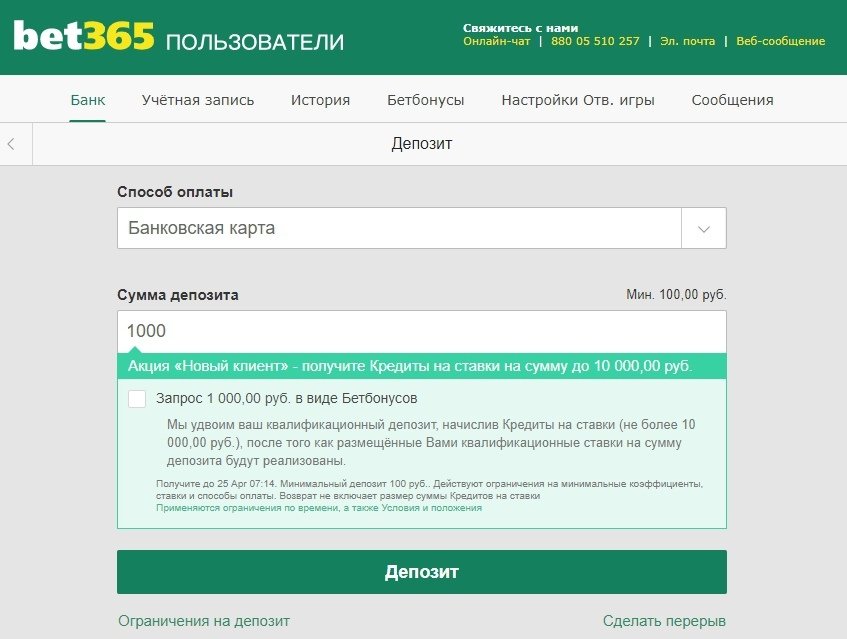 Пополнение счета Bet365 с помощью банковской карты