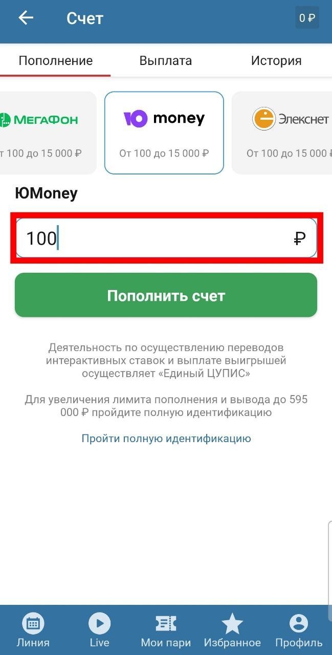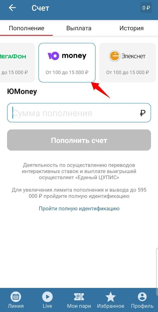 Букмекер сотрудничает с системами электронных платежей «Кошелек ЦУПИС», и «ЮMoney» («Яндекс.Деньги»). Чтобы пополнить счет таким способом: