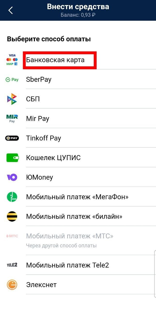 банковские карты VISA, MasterCard, «Мир», Maestro;