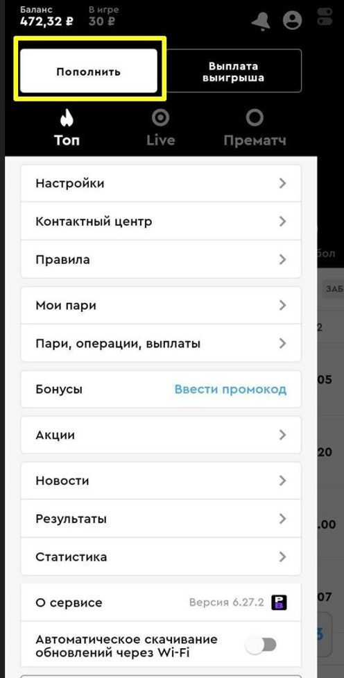 Для пополнения счёта зарегистрируйтесь в букмекерской конторе Pari или войдите в личный кабинет. После авторизации откройте меню и нажмите кнопку «Пополнить». Далее придерживайтесь инструкции: