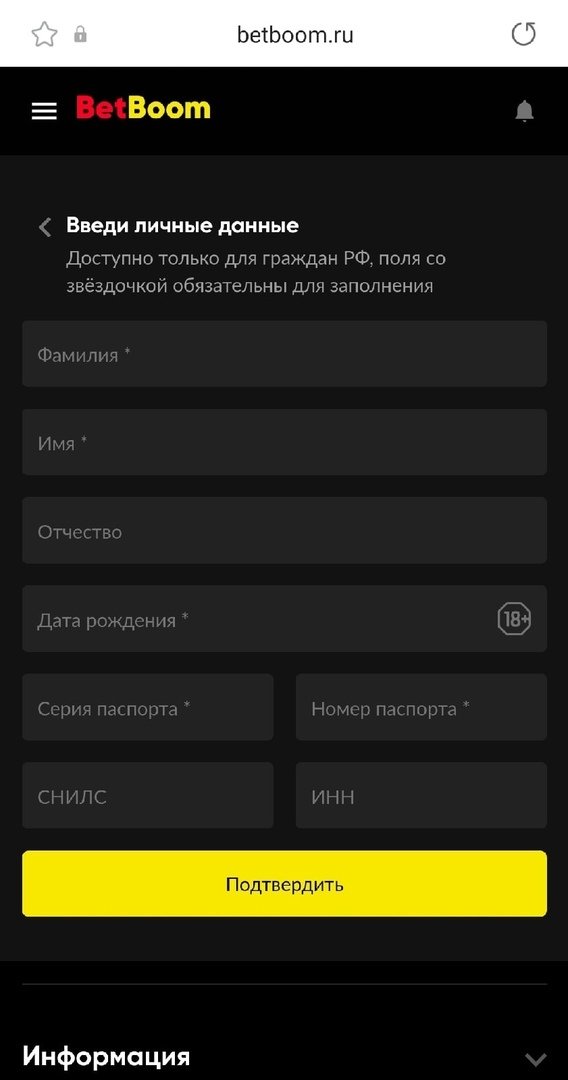 Помимо фото паспорта, букмекер даёт клиентам возможность пройти упрощённую идентификацию, введя свои личные данные: