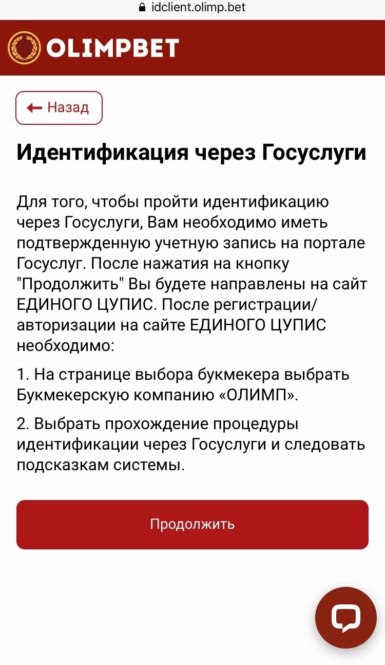 Через портал «Госуслуги». Откроется сайт Единого ЦУПИС, где потребуется зарегистрироваться/авторизоваться, выбрать Olimp в списке букмекеров, нажать на идентификацию через сайт госуслуг и авторизоваться на «Госуслугах».
