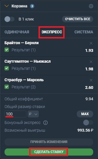 Выберите ставку экспресс, введите сумму пари и нажмите кнопку «Сделать ставку».