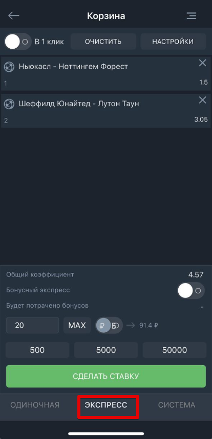 В окне «Корзина» в правой части экрана выберите ставку экспресс.