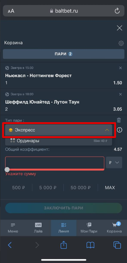 Как сделать ставку экспресс на мобильной версии сайта БК «Балтбет»