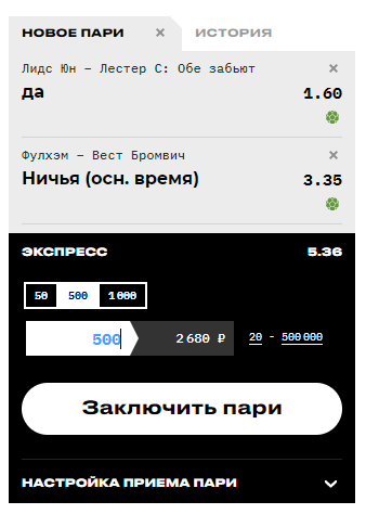 Заключено пари на 500 рублей. Итоговый коэффициент 5.36 получен как произведение двух котировок исходов, включенных в корзину: 3.35x1.60. Расчёт будет таким: