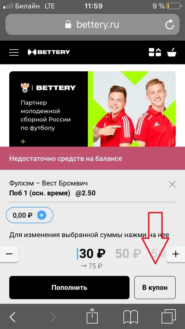 Как сделать ставку-экспресс в мобильной версии сайта БК BETTERY