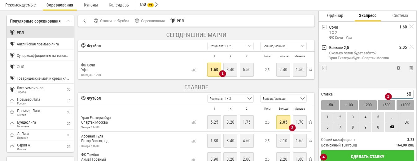 Если вы угадаете исходы каждого события, ставка в 500 рублей принесет 3350 рублей чистой прибыли.