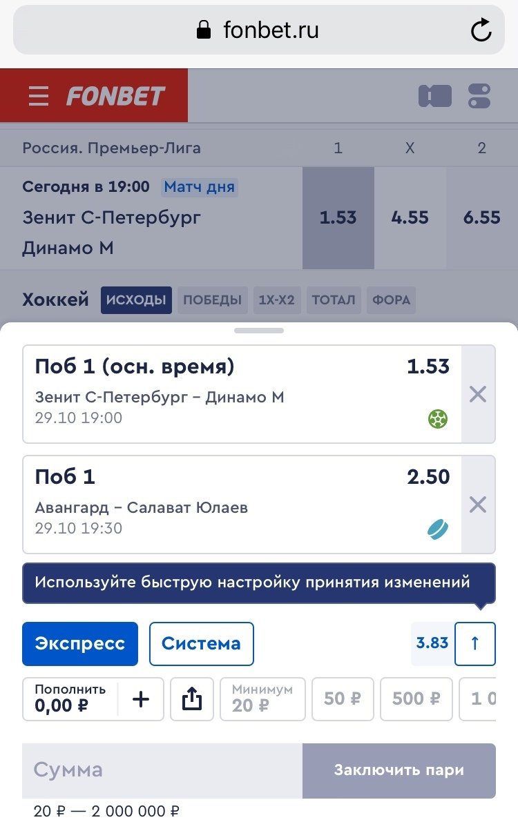 Как сделать ставку-экспресс в мобильной версии сайта БК Fonbet