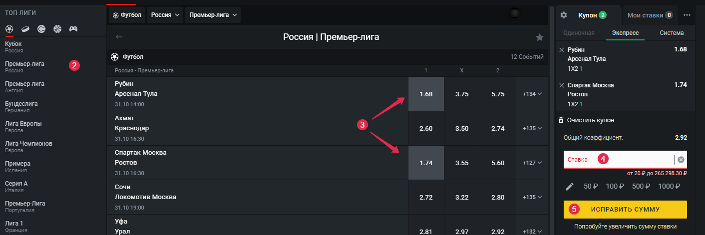 Составить экспресс и сделать ставку на официальном сайте leon.ru можно за 5 шагов: