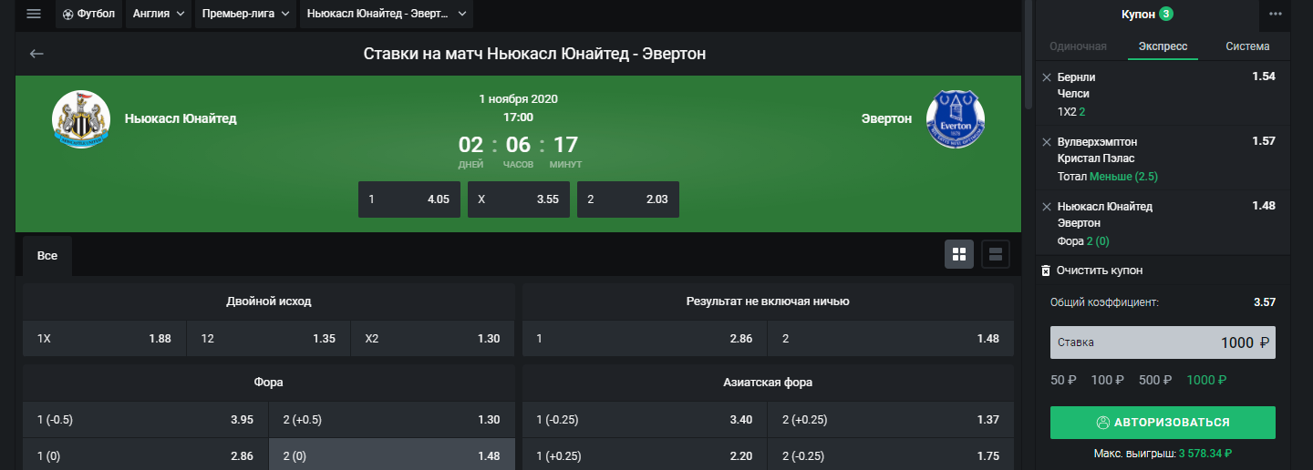 Понять, как рассчитать итоговый коэффициент экспресса, проще всего на примере. Сделаем ставку на три матча английской премьер-лиги и узнаем возможные варианты расчета.