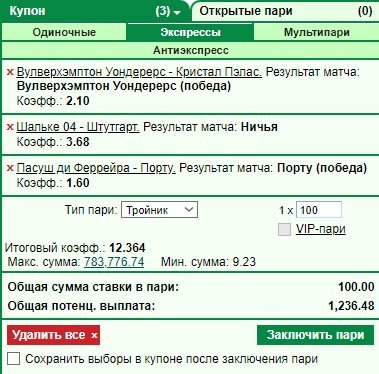 Ставка выиграет, если пройдут все три события, указанные в купоне. Итоговый коэффициент «экспресса» — 12.364. Это значит, что поставив 100 рублей, можно получить 1236 рублей (1136 рублей чистыми).