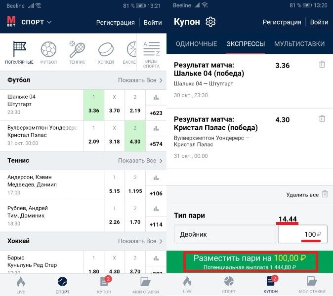 Одно из отличий — разделы Live и Спорт (букмекерская линия) находятся на нижней панели, а не в верхней части экрана. Это можно назвать плюсом программы: в разделы Live, «Спорт», «Купон» и «Мои ставки» можно быстро попасть с любой страницы приложения. Процесс оформления ставки типа «экспресс» выглядит аналогично.