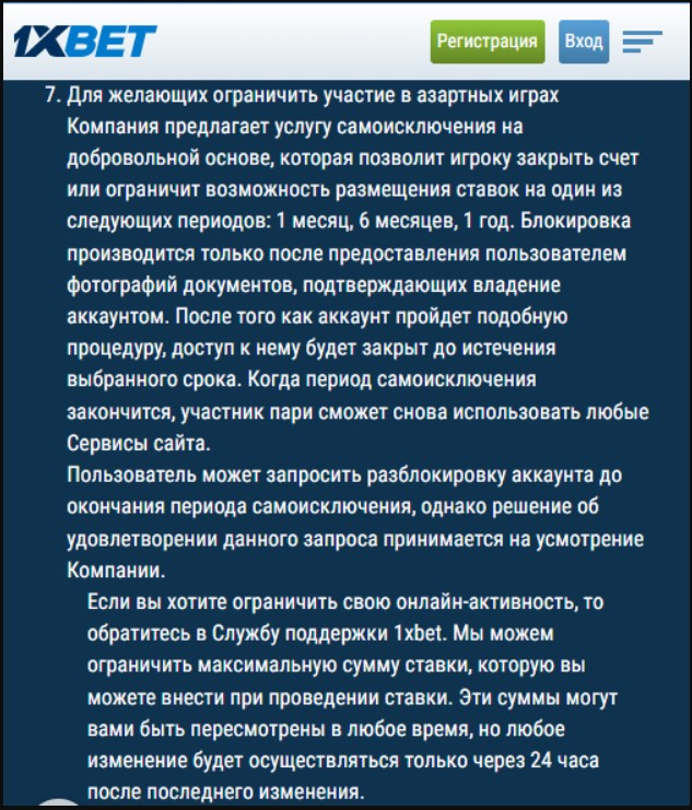 Также по запросу клиента 1xBet может ограничить размещение ставок на определённый период или снизить лимиты.