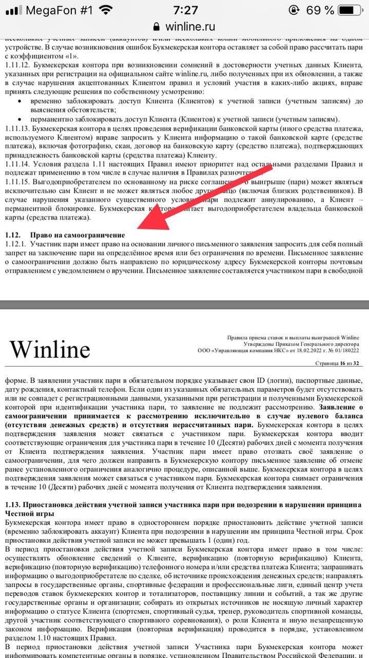 Раздел «Право на самоограничение» в Правилах БК Winline
