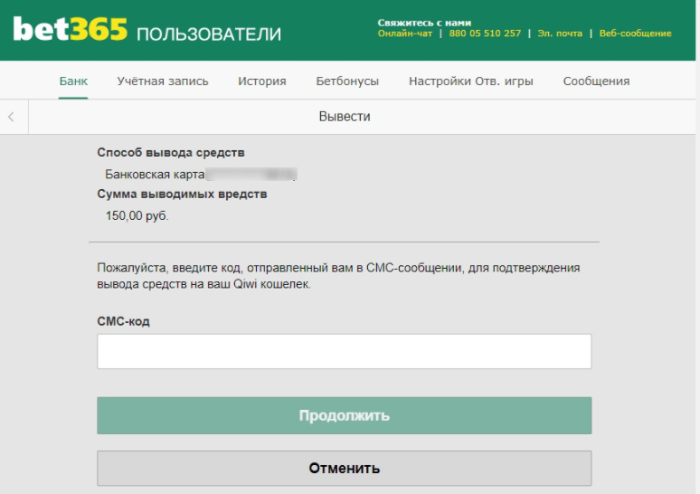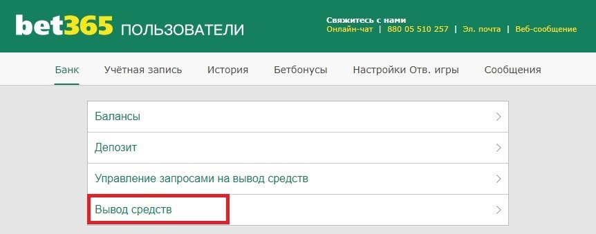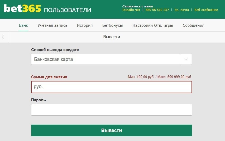 Букмекерская контора «Бет365» предоставляет игрокам 2 способа вывода денег: