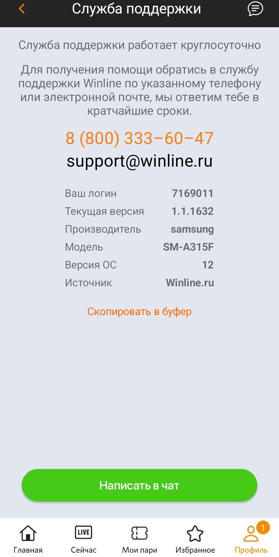 Связаться с поддержкой букмекерской конторы через онлайн-чат, по телефону 8-800-333-60-47 или отправить письмо по почте support@winline.ru.