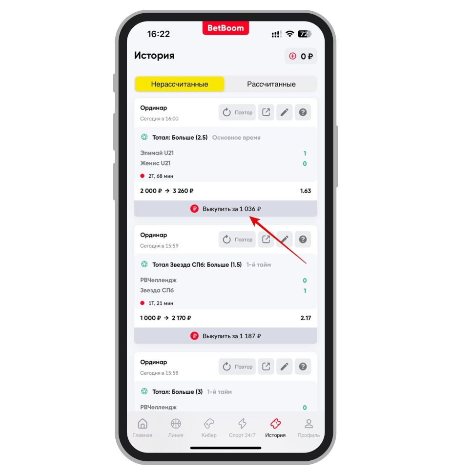Откройте историю пари, найдите интересующую ставку и проверьте, доступен ли выкуп. Если да — нажмите «Выкупить» и досрочно завершите пари.