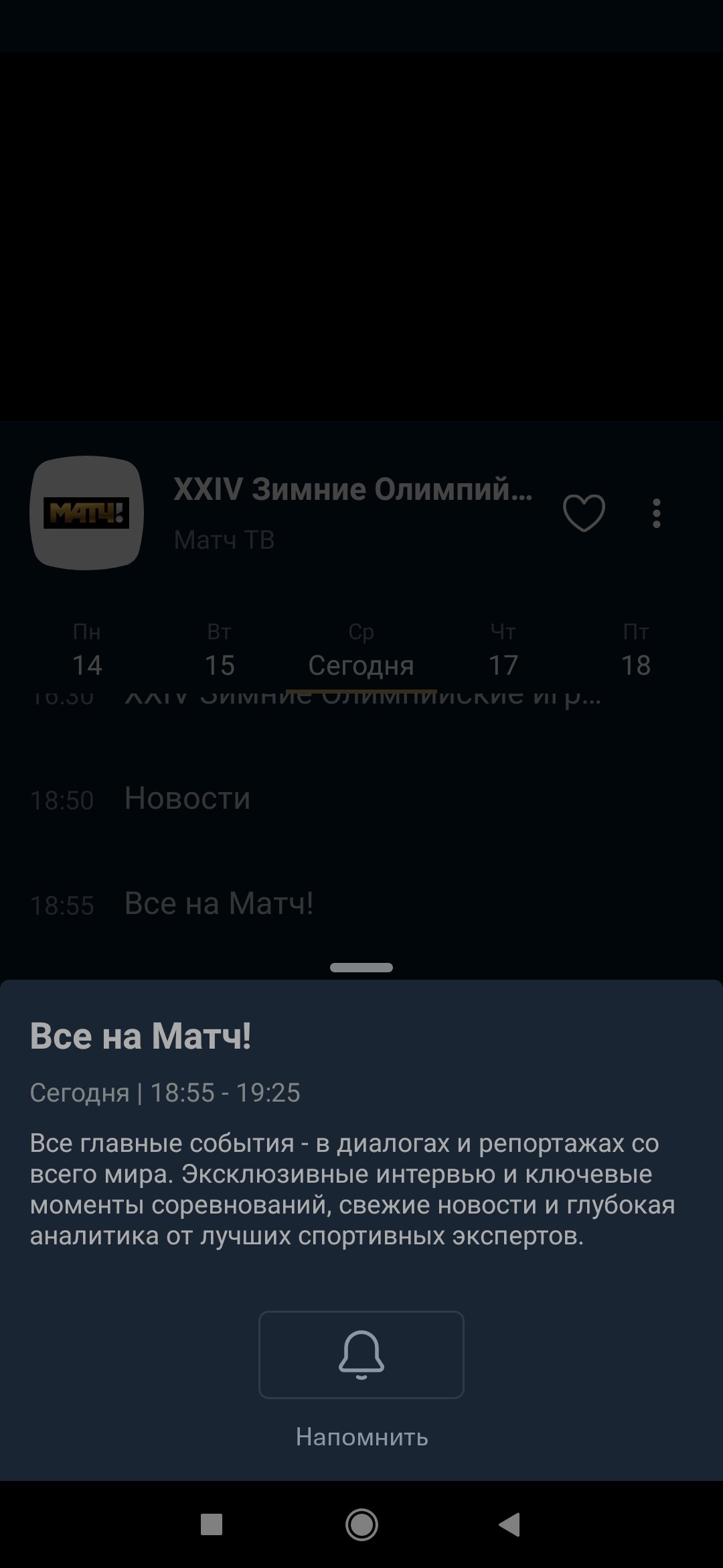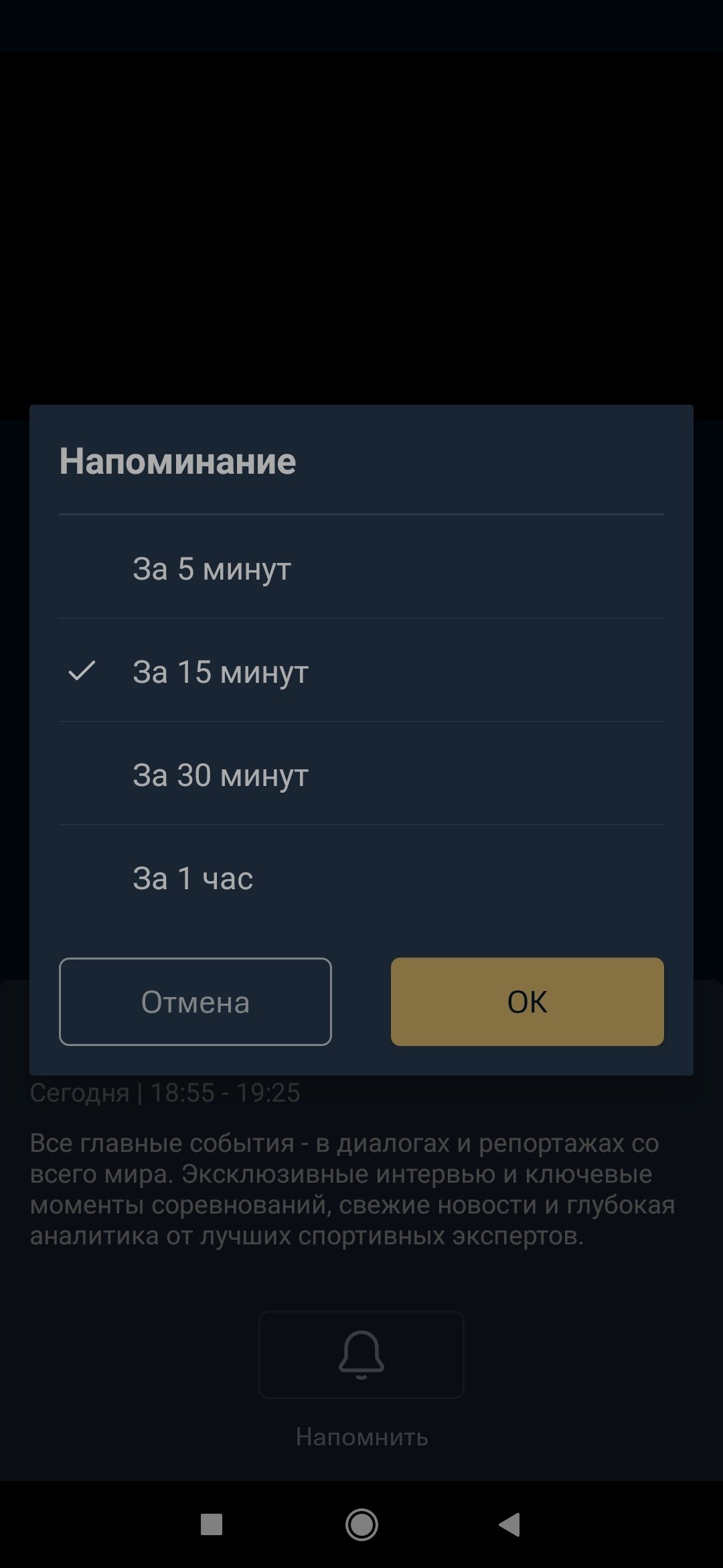 В мобильном приложении или на сайте KION есть оповещения о начале события. Чтобы включить их, перейдите на нужный канал, кликните на нужную передачу и нажмите на колокольчик. Время напоминания можно выбрать самостоятельно — за 5/15/30/60 минут.