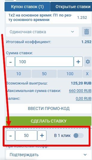 В купоне пользователь мог настроить приём ставки в один клик. Достаточно было указать сумму и переключить соответствующий тумблер.