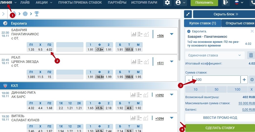 Заключить пари в компьютерной программе можно было за четыре шага. Игроку следовало: