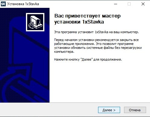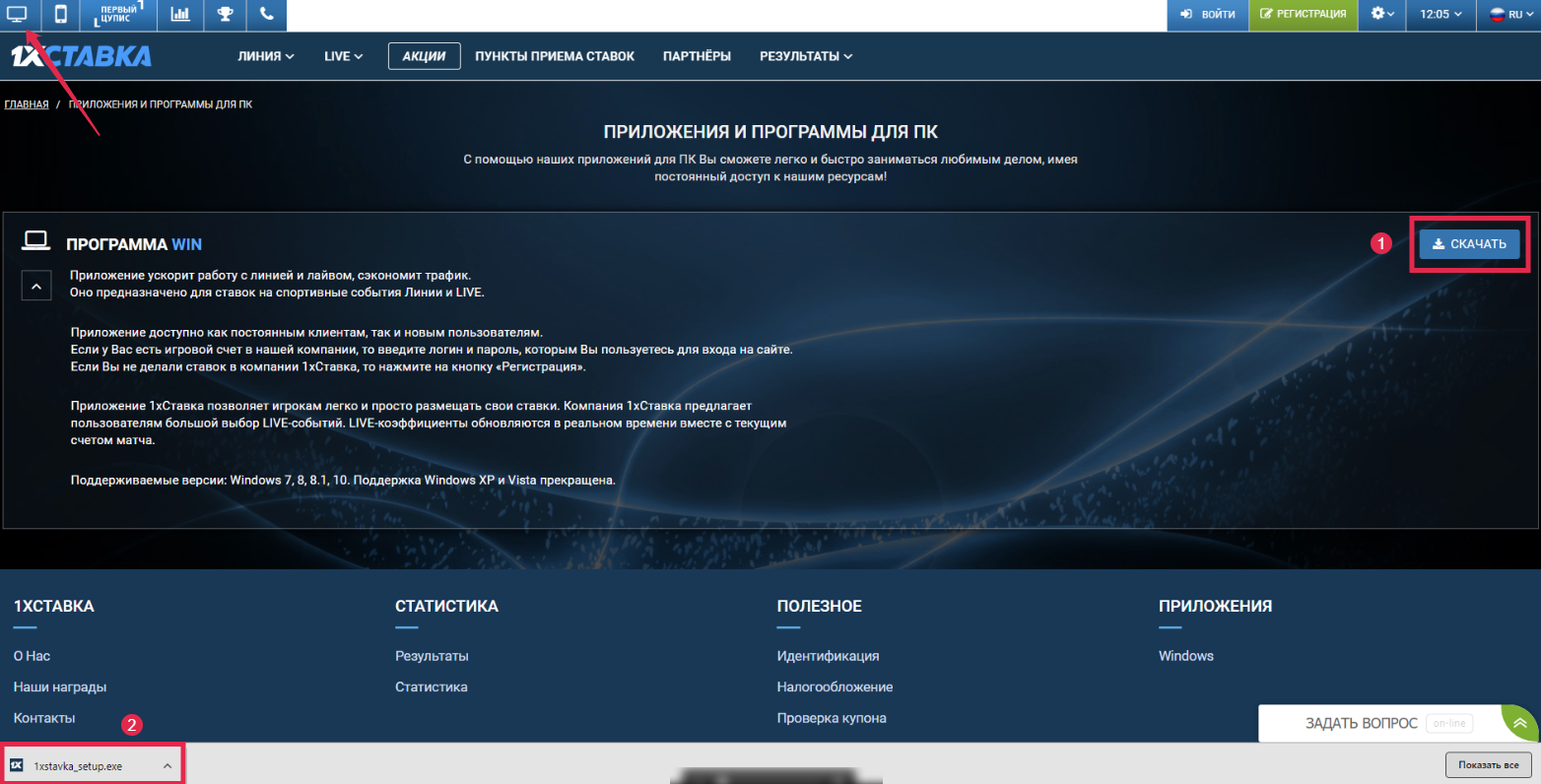 На официальном сайте 1xstavka.ru в левом верхнем углу экрана была иконка с изображением монитора. Она вела на страницу с программой для Windows. Для установки ПК-клиента требовалось: