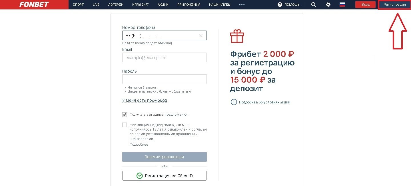 Регистрация на ПК-версии сайта «Фонбет» через Сбер ID
