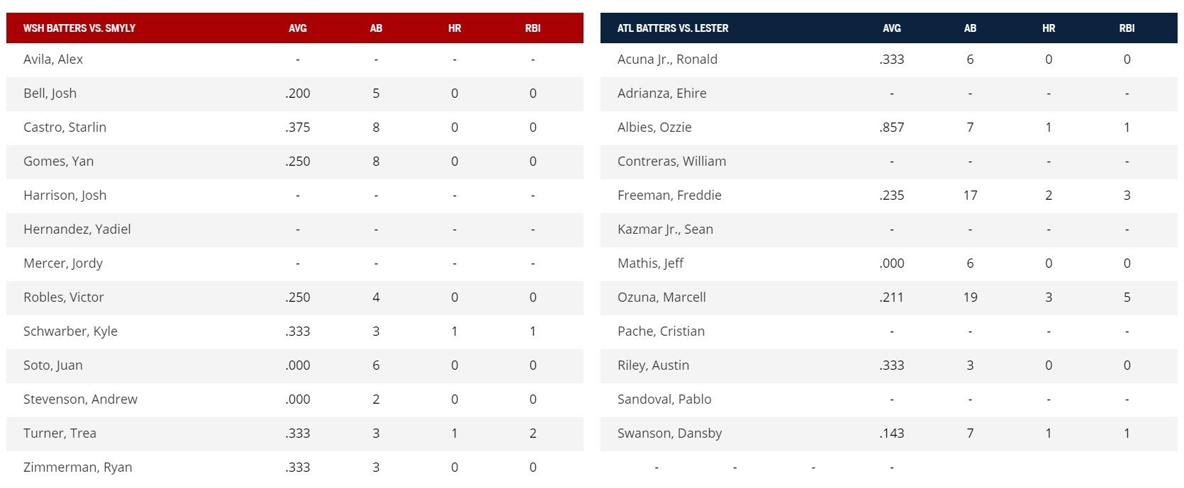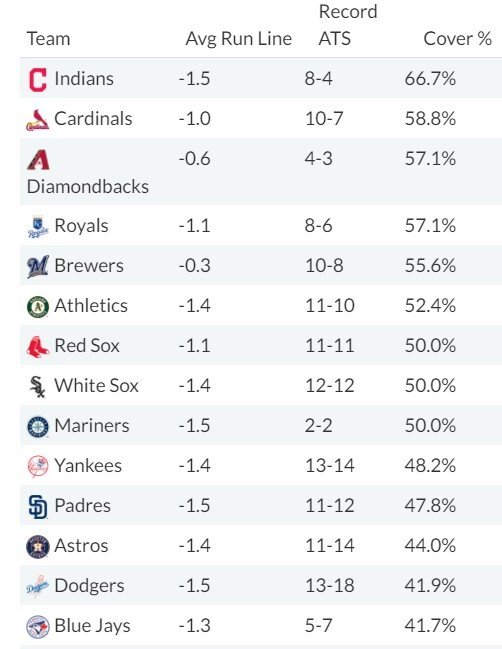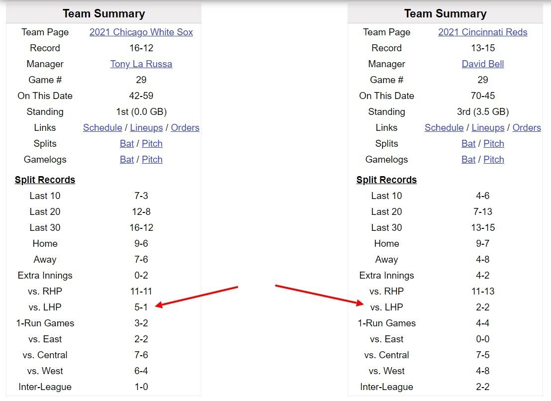 На странице превью baseball-reference вы найдете карточки команд. Обращать внимание тут стоит не столько на баланс побед и поражений, сколько на серьезные диспропорции в игре против питчеров-правшей и левшей. Но, конечно, лучше удержаться от ставки на команду, которая идет на серии из 4 и более поражений.