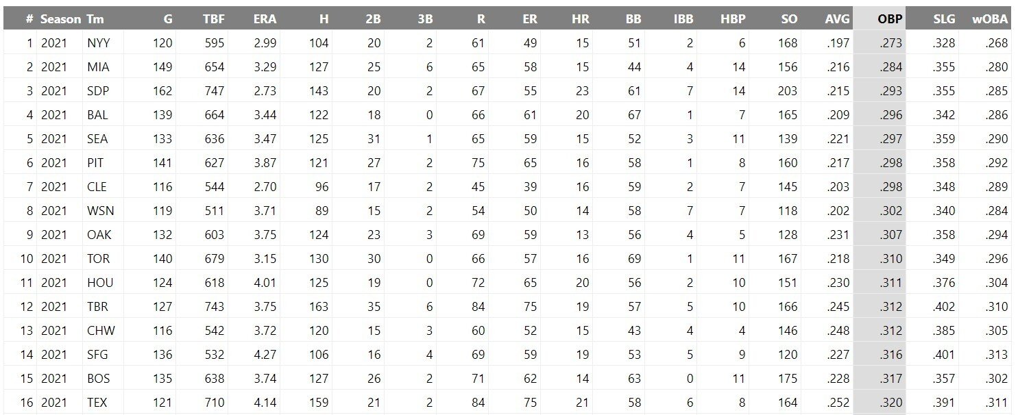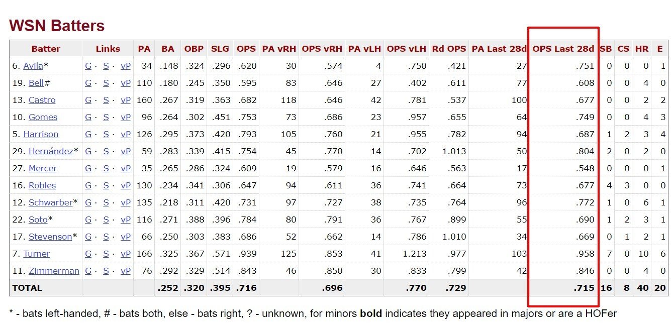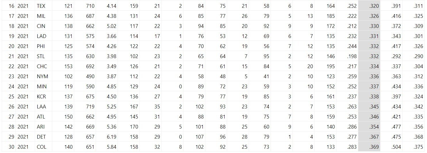 Также учтите цифры среднего количества ранов за матч. Больше 5 ранов — очень сильная атака, меньше 4 — откровенно слабая. Вторая важная вкладка — статистика отбивающих. Тут самая важная колонка с OPS за последние 4 недели. Этот показатель нужен, чтобы отследить текущую форму.